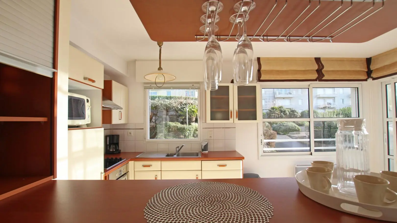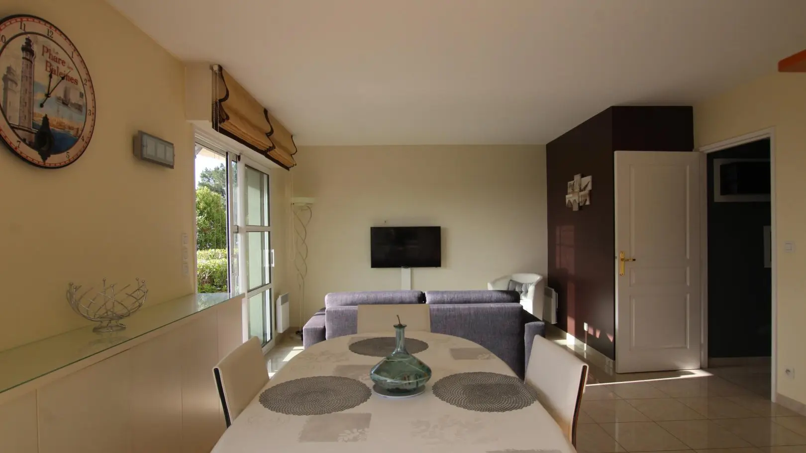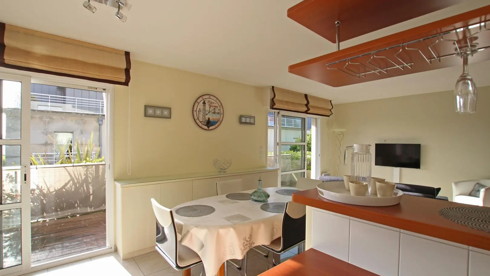 Wohnung im Erdgeschoss eines Gebäudes mit Aufzug. Wohnzimmer (TV) mit ausgestatteter Küche (Backofen, Induktionskochplatten, Geschirrspüler, Kühlschrank, Mikrowelle). Schlafzimmer 1 (Bett 140x200). Schlafzimmer 2 (Bett 140x200). Badezimmer (Waschmaschine). wc. Geschlossene Holzterrasse. Gartenmöbel. Abstellraum im Untergeschoss. Privater Parkplatz. Bettwäsche und Handtücher können gemietet werden. Reinigungsservice gegen Aufpreis. Elektrische Heizung gegen Aufpreis.